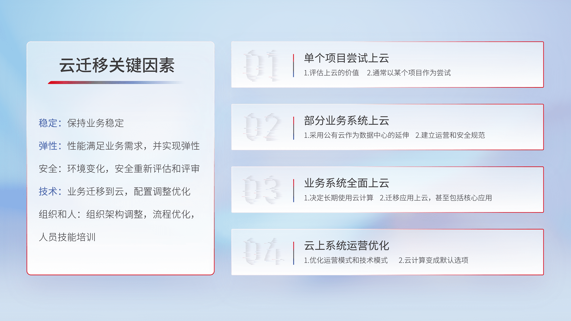 结合实际业务,,,,从规划设计、、、、云平台选型、、云原生改造、、、、数据迁移、、、集成交付,,,,迁移全过程为客户识别最佳上云路径,,,,做好风险识别管理,,设计网络架构、、、身份权限、、安全审计合规、、、操作审计、、、、日志审计、、、、监控告警策略、、多站点容灾设计等,,对云上基础设施进行整体规划,,,提升IT治理水平,,,,以满足弹性、、高可用、、、高性能的需求。。。。