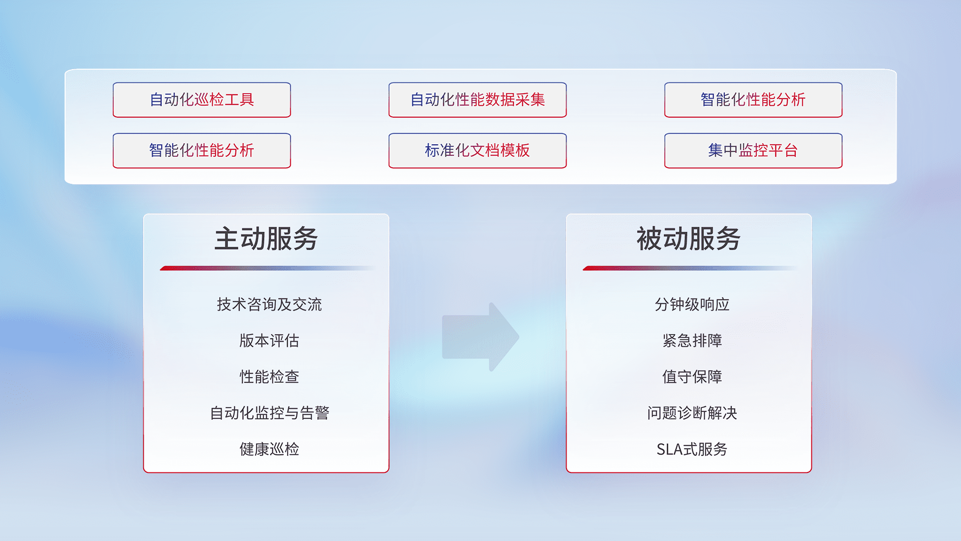 智能化工具和标准化文档,,,,保障服务质量,,,提供主动服务(包含技术咨询、、版本评估、、、性能检查、、、自动化监控与告警、、、、健康巡检)和被动服务包含(分钟级响应、、、、紧急排障、、、、值守保障、、、、问题诊断解决、、SLA服务)。。。。